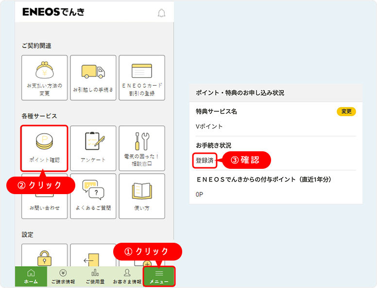 - ①「メニュー」→②「ポイント確認」→③「Vポイントご利用申込」をクリックしてください。